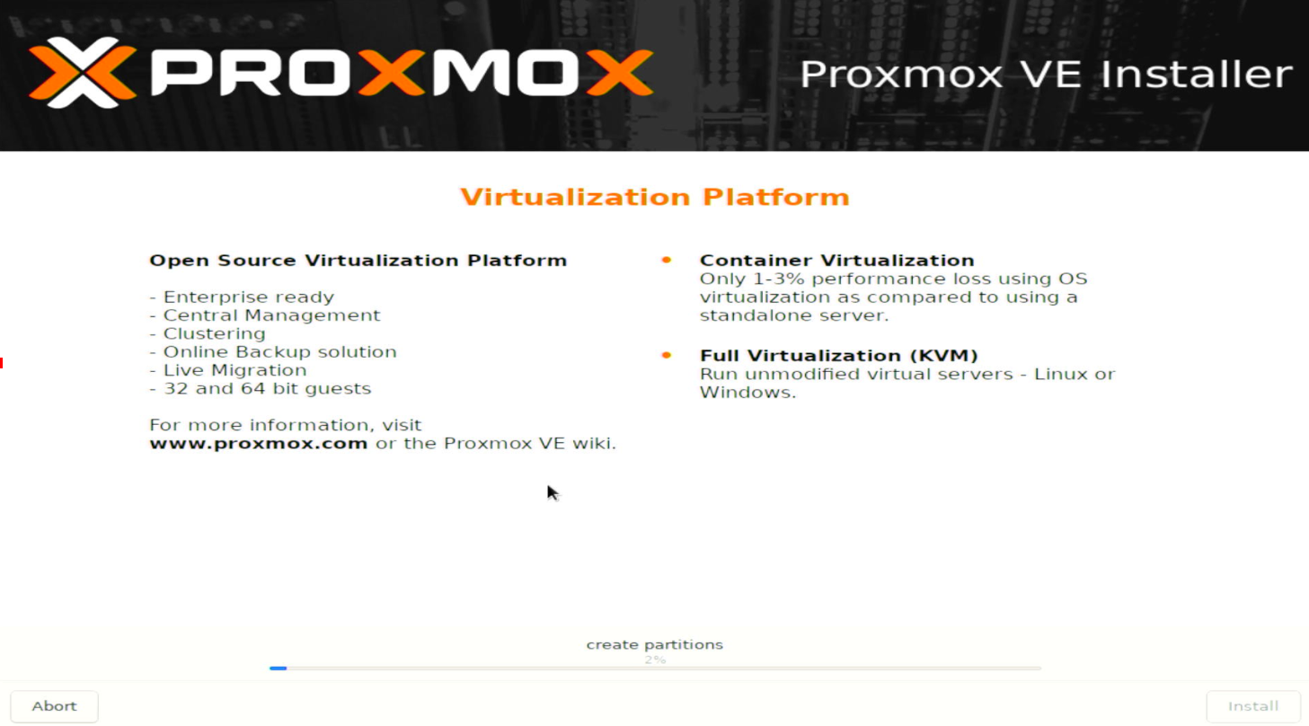 インストール中はProxmoxの機能の紹介や宣伝が表示される。暇つぶしに英文を読むがよい。