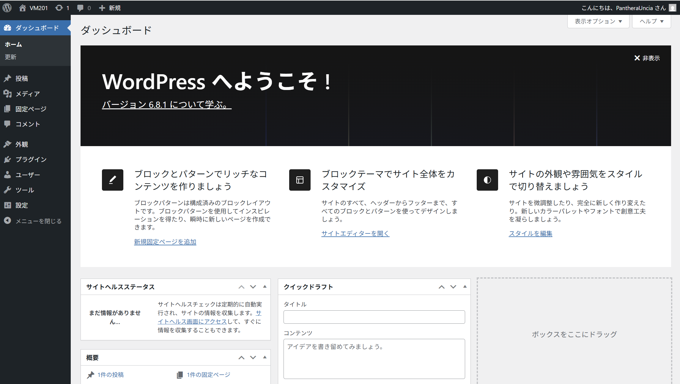 ログインに成功すると、WordPressダッシュボード画面に遷移する。