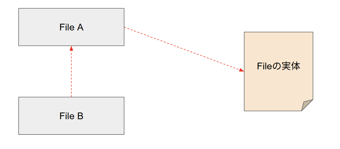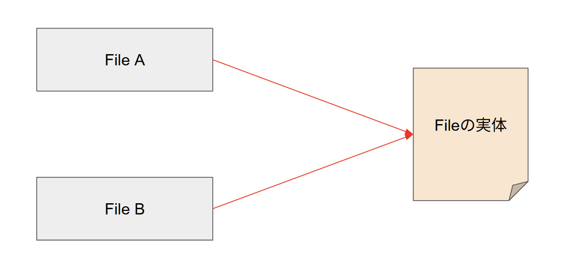 ファイルの実体(ディスク上に保存されているデータ)が1つでもその実態を参照するリンクがあれば、それぞれのファイル名で同一の実体を参照することができる。