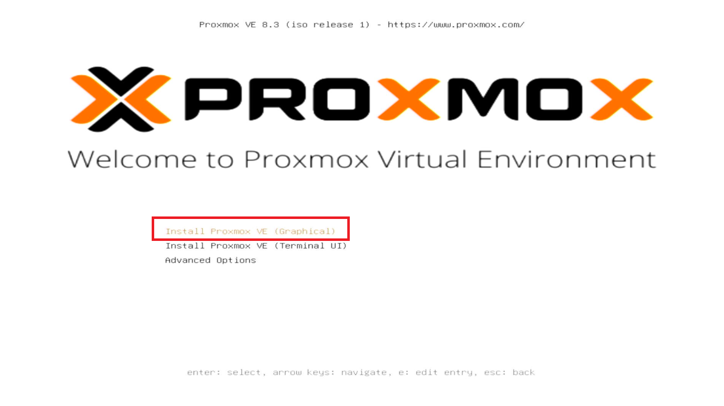 USBメモリから起動すると、Proxmoxのインストール画面が表示される。今回はグラフィカルモードでインストールを行うため一番上の項目を選択し、Enterキーを押下する。