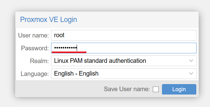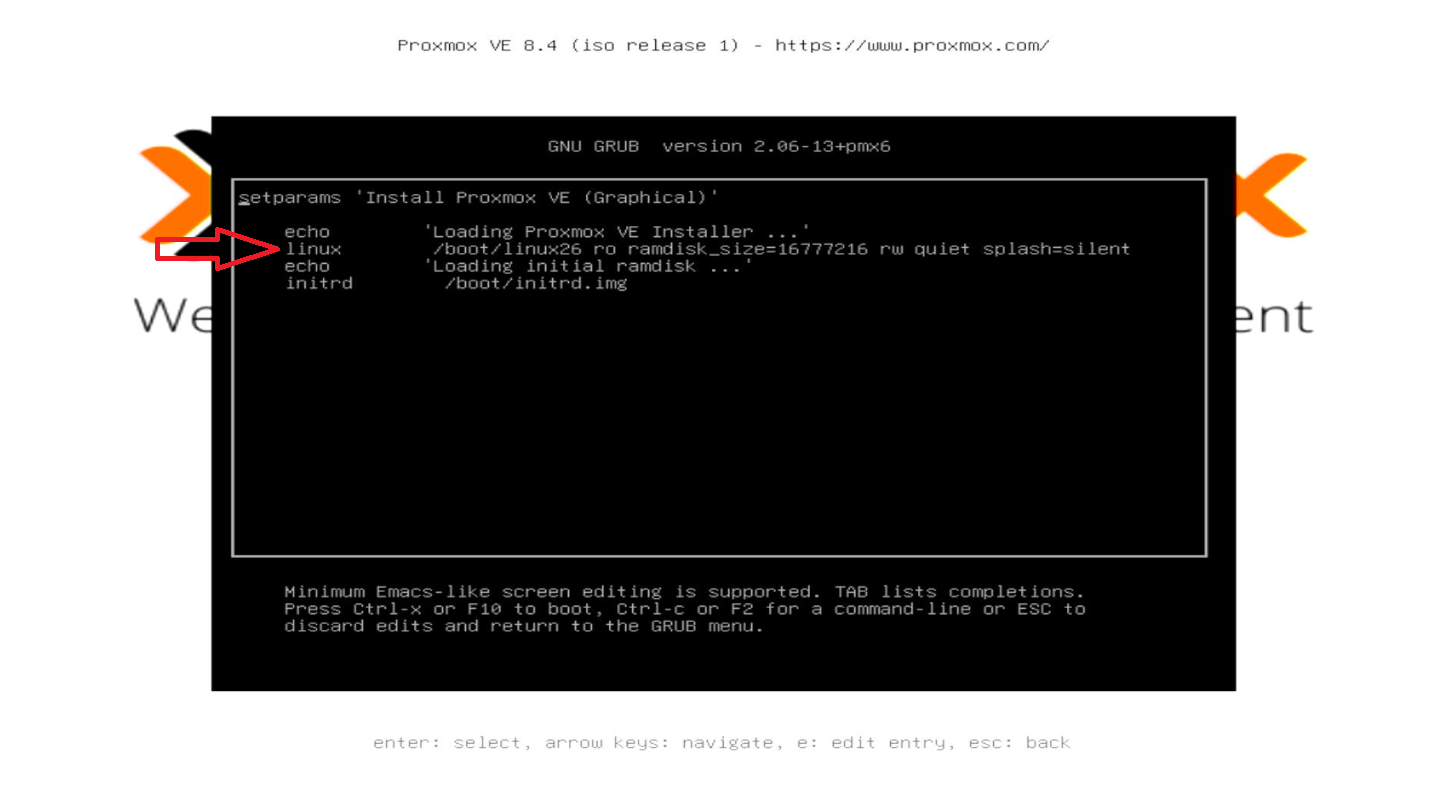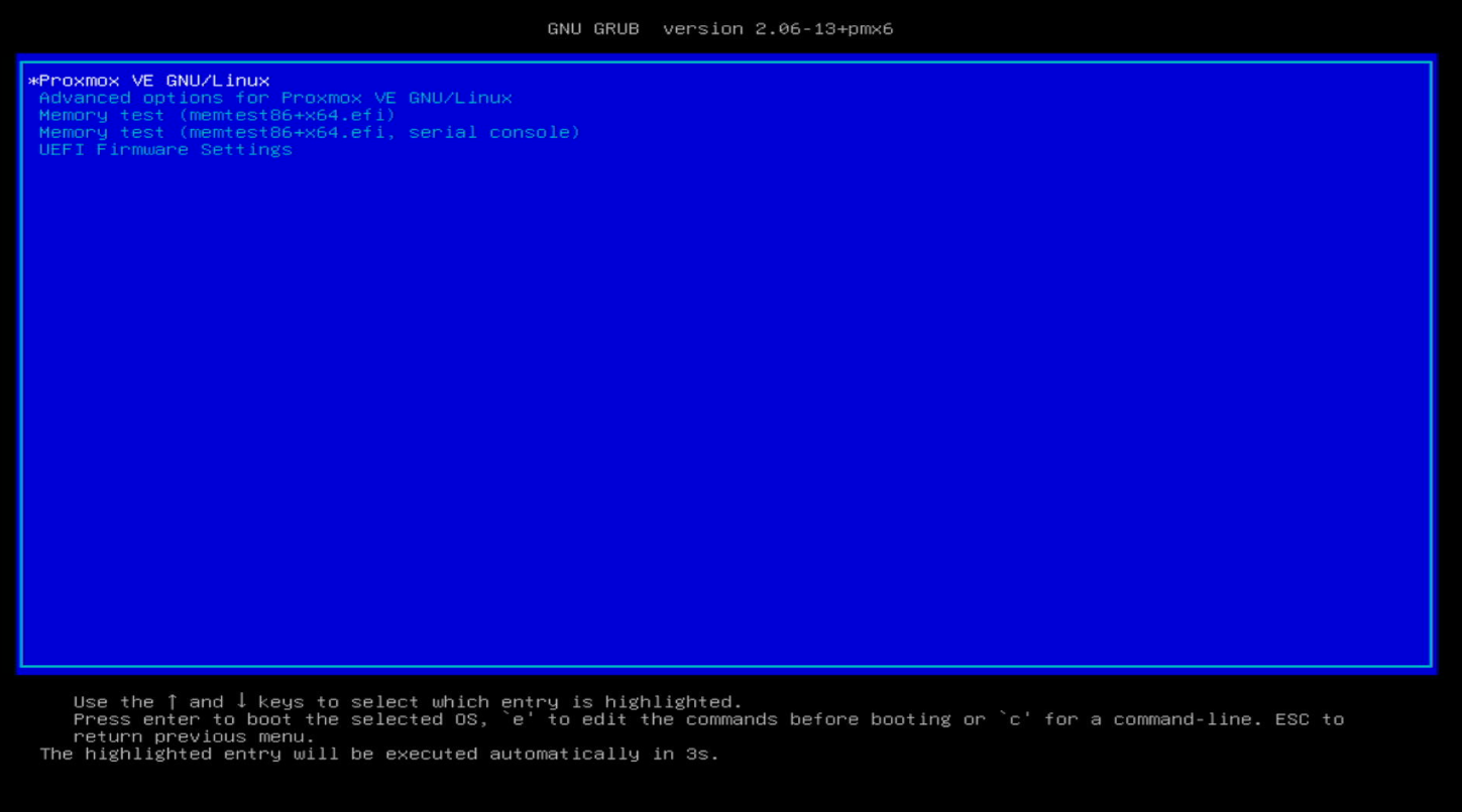 Grubの青い画面では特に何もせず、自動選択されている項目 Proxmox VE GNU/Linux のままで良い。