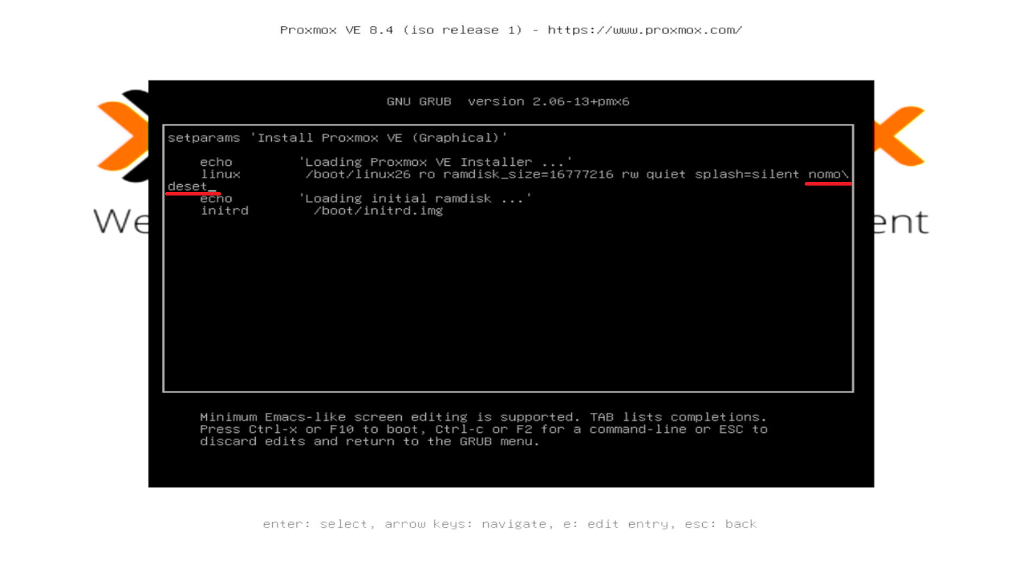 もしロード中に停止するようであれば一旦PCを起動しなおす。再度インストール画面が映し出されたら、キーボードのEキーを押下しlinuxの行末に以下を記述する。解像度によっては入力した文字列が自動的に改行され、バックスラッシュが入るが気にせず入力しEnterキーを押下する。