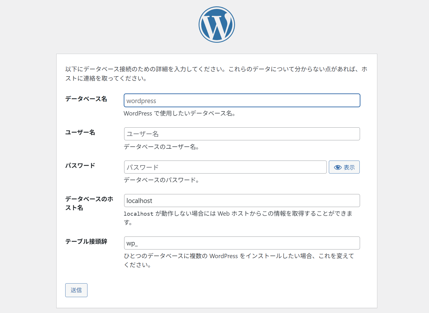 データベース名: wordpress (MySQLにログインして作成したデータベース名)
