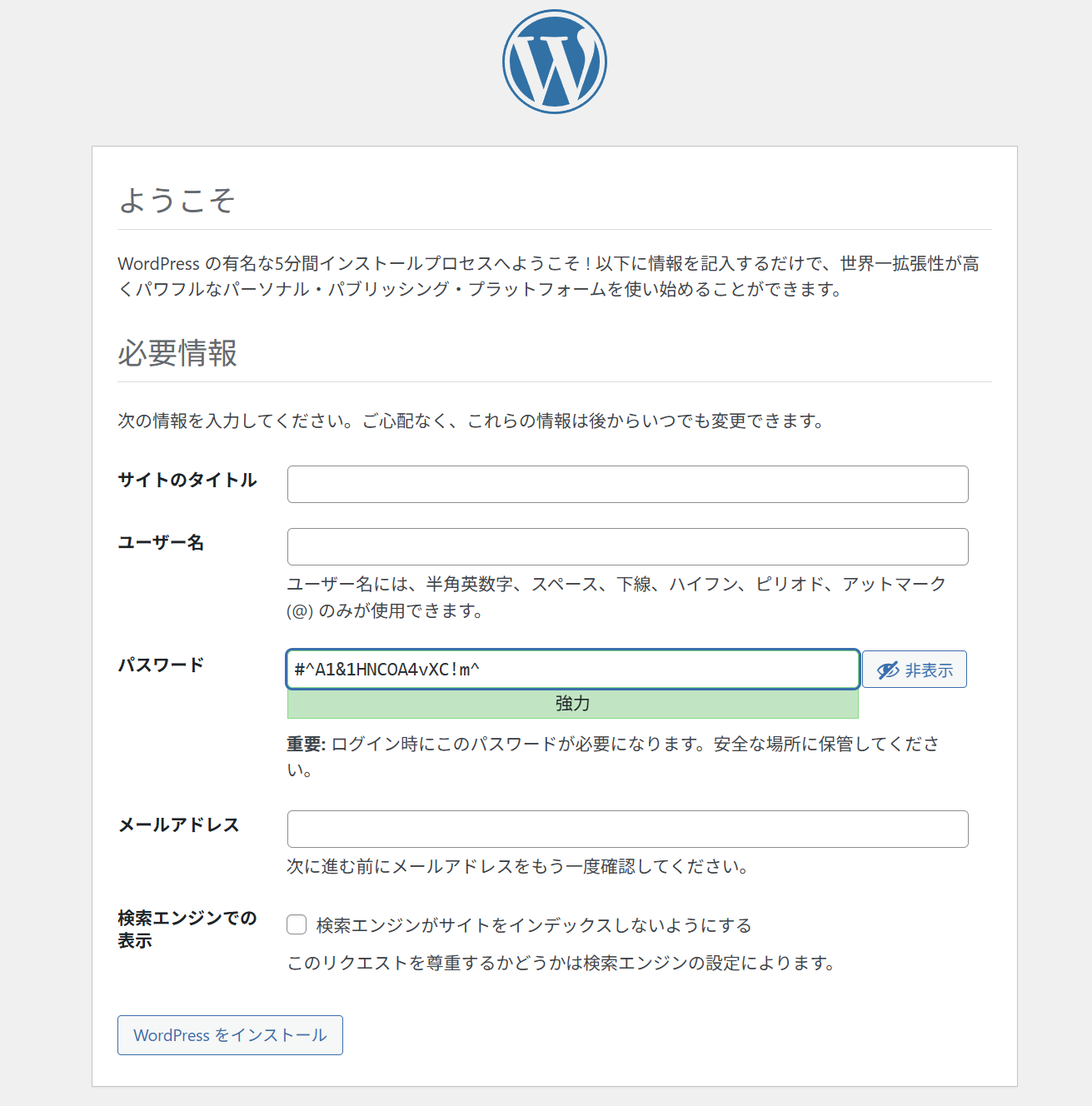 一通り入力し終えたら、WordPressをインストールボタンを押下する。(パスワードなどログインに必要な情報はメモしておくこと。)