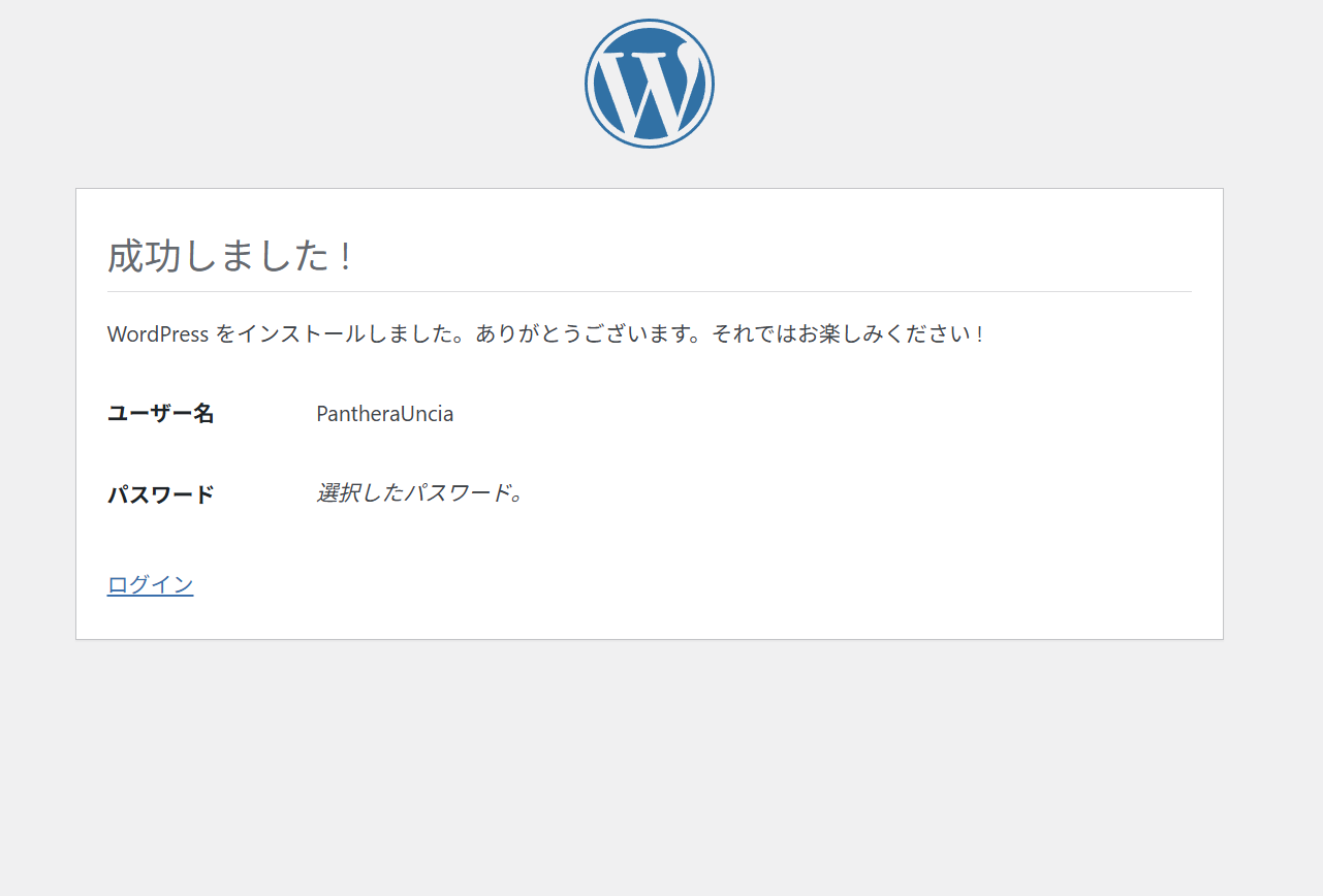 WordPressのインストールが正常に完了したので、上で作成した管理者ユーザとパスワードでWordPressにログインする。