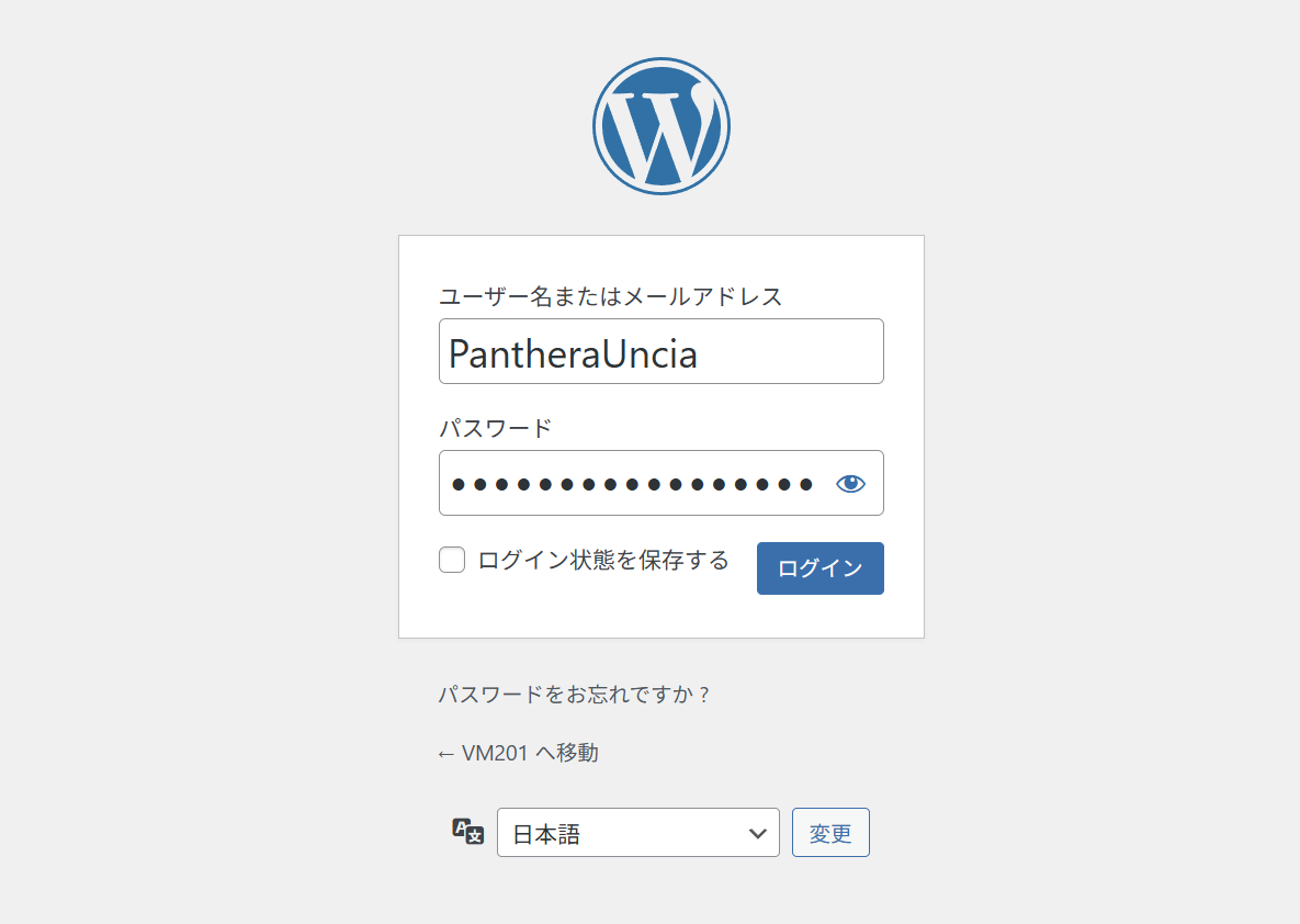 パスワード: wpadmin のパスワード (ユーザ作成とともに作成した大文字小文字数字記号パスワード)